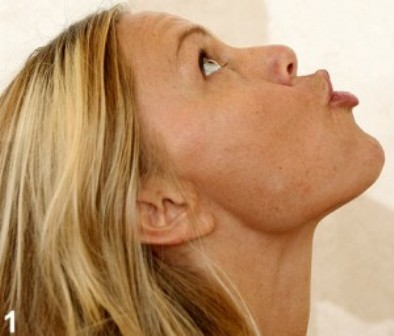 - Lift your face up, looking at the ceiling and blow air out of your mouth.