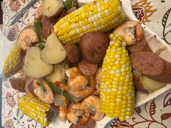 Boil the water and add the old bay seasoning to it in a big pot. When it boils, add the potatoes and cook without the cover for ten to fifteen minutes. Now add the meat and the corn to cook for another ten minutes. By now the potatoes would be tender, so you can add the shell covered shrimp to it, and cook for ten more minutes. Drain the mix and serve with fresh spinach.