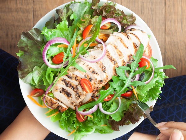 this could be the leftover grilled chicken to which a mashed boiled egg is added. Mince the two well in a blender and form a paste. Cut veggies of your choice, make them colourful and add a teaspoon of olive oil. Mix the paste and the veggies, toss with cilantro and thyme, and munch away.