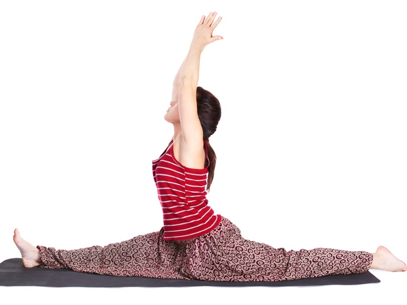 You will also have to ensure that your body is bent sideways, not forward nor backward. Also makes sure that your pelvis and waist are wide open. Stretch as much as possible but keep steady at the same time and continue inhaling and exhaling vigorously. Now, bring your arms up to the sides while inhaling and straighten your legs and feet.