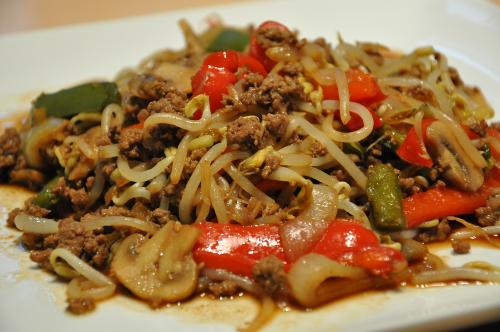 In a frying pan put the meat, veggies and onions, with the oil and sauté them all well. Mix the sauce in it and stir fry. This should be done in ten minutes, and it has low calories to keep your tummy full till the next meal.
