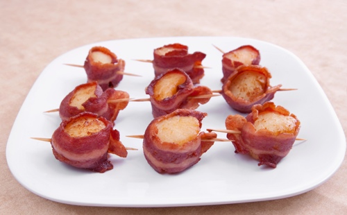 Pick a few bacon slices from the market, not the processed ones though. Wash and clean them, and to this add a chopped onion and tomato with cilantro and basil leaves. Salt and pepper to taste if you must, since bacon would have the salts you need. Wrap the bacon around the condiments and steam well for five minutes, the fats would melt and you have goodness in a wrap.