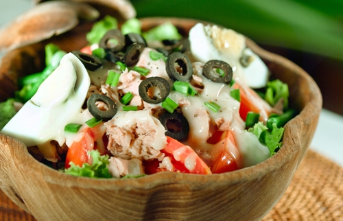 Three boiled eggs thinly sliced and a large tuna or salmon shredded to bits. Steam them both together and add salt, pepper and a dash of lime. Cover in a foil and in a separate bowl use spinach and lettuce leaves as base. Pour the condiments on it and refrigerate for an hour. Eat it chilled!!