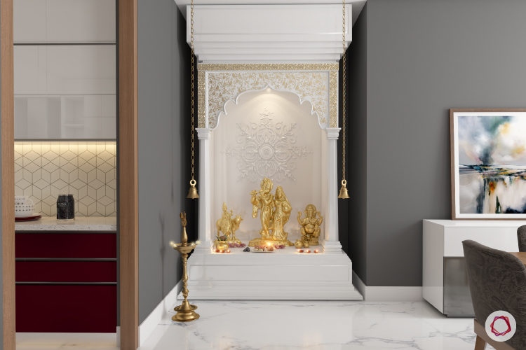 This idea of pooja units in small flats is trending because of its ease and convenience. You don’t need anything special to use this design, which is one of the main reasons why most of the small apartments now use this idea of having a mandir in their place.