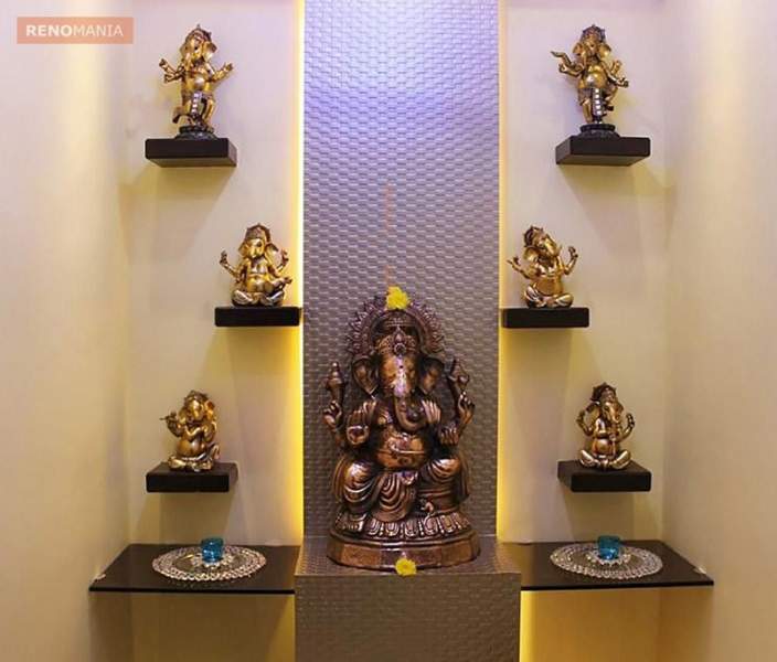 You can have the entire wall to make your pooja room and use it as you like. It has many decorations, pictures, idols, etc., as you want on the wall. You can also play with the wall colour to represent it as your own pooja room designs in small apartments in a distinguished manner.