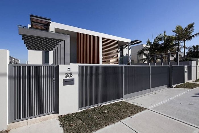 Here is an elegant fencing idea for your modern home. Although quite basic, the simple fence gate design has a contemporary feel to it. It is made with vertical metal louvres for better visibility from the inside and also protection from direct views of the outside. A sliding gate is added to it for opening and closing, which seamlessly blends with the railing.