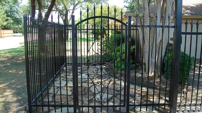 This fencing design is a metal extravaganza. The floral-inspired gate is a playful idea worked on the metallic frame. From a distance, it gives the illusion of a blooming garden around your property and grabs the attention of the onlookers. Even the gate is coordinated with the fencing to create this artistic marvel!