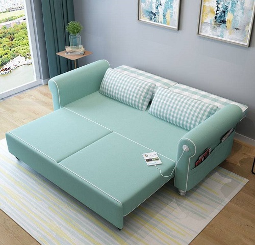 This long and comfortable sofa, which also doubles up as a bed, lets you marvel at its beauty at leisure. The exquisite colour lends it extra charm while allowing it to match the surrounding decor without clashing too much. It is a class apart and gives the hall a youthful vibe, while also providing a port for charging your devices comfortably. The checkered cushions make the sofa set stand out with a timeless appeal.