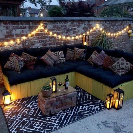 Illuminating your rooftop is perfect for elevating the space, whether you have a small or a large terrace. The obvious choices are overhead bulbs, hanging lanterns and enclosed sconces. In addition, you can either drape string lights along the vertical beams or place them along the wall. Furthermore, putting tea candles on the outdoor dining table or along the fence can be a perfect choice to create a romantic atmosphere. Finally, with all the illuminating décor, choose bold-coloured cushioned sofas or seating accessories that stand out beautifully.