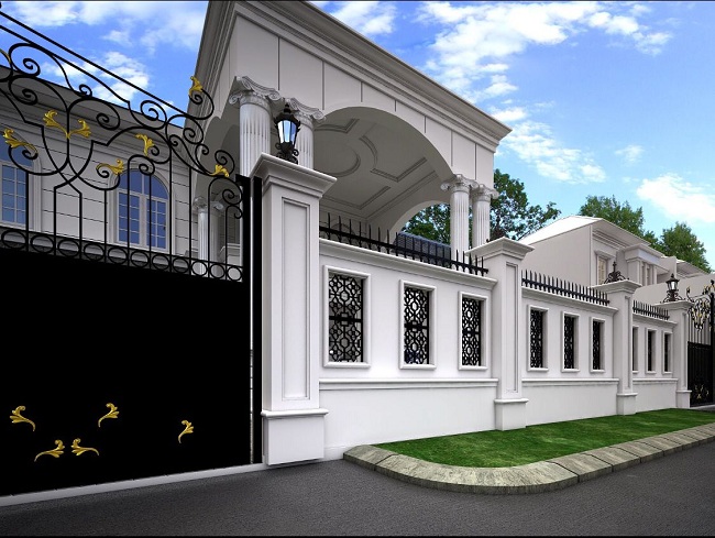 In modern times, compound wall design boasts trendy patterns and cut-outs, giving the home an elegant look. As you can see in the picture, you can use a combination of stainless steel grills and masonry walls, creating an attractive ornamental wall design. Furthermore, you can always customize the wall with animal prints or metal latticework if you enjoy intricate patterns that stand out. The combination of whitish-grey and black colours for the compound wall with a tinge of white can make them look classy.