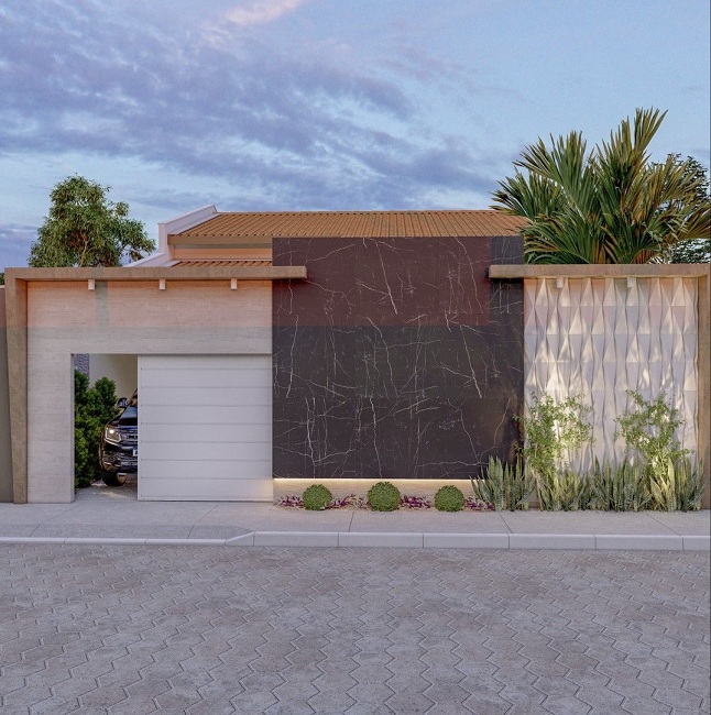 When you want to enhance the overall aesthetics of your property, incorporating a chic compound elevation design can be an ideal choice. Unlike the other options where wood has been included, this compound wall has several stylish geometric patterns and a little wedge, creating a step-like design and placing plant life in the extra space right in front of the giant wall. The black marble flooring beautifully contrasts with the wall and matches the interiors.