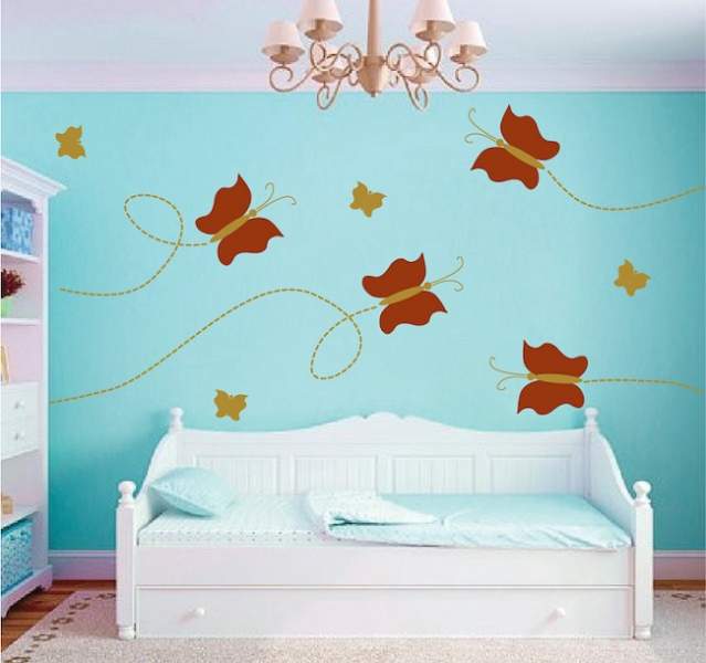 Simple butterflies in this design are brown with the background wall in light blue. The bed placed against the wall is a tiny white bed and a light blue comforter and pillow matching the colour of the wall. This design gives you a feel of being in nature’s lap. The blue colour soothes your eyes and lets you sleep well at night.