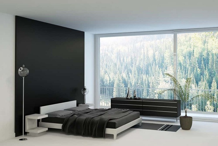 This is a perfect design for people who love enjoying an outside view all day, every day. The back of the wall behind the bed has a black frame from top to bottom, and the entire sidewall is see-through glass. This is a beautiful way to wake up with warm sunlight or a perfect view during rain. But if you are worried about privacy, you can add thin curtains to complete the look.
