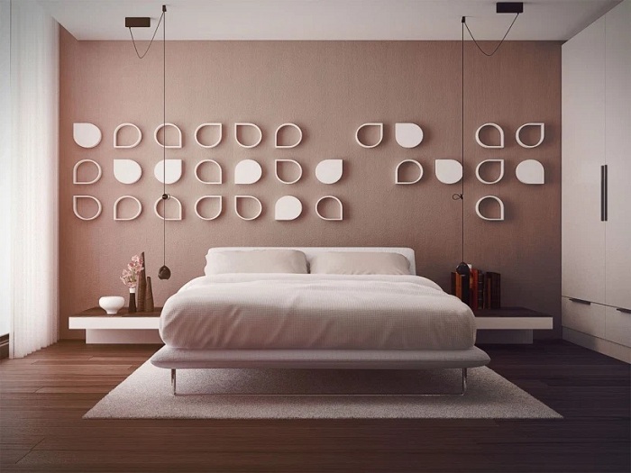 Presentation matters in everything we do; this is a bedroom wall design that has a beige background with significant tear-shaped or petal-like elevations that give a 3D effect to the wall. Since the wall colour is beige, the petal-shaped things are made of white colour. The contrast between the two creates a beautiful effect.