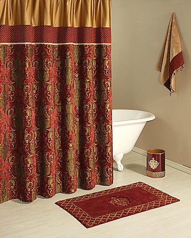 Discover this premium series of red and gold shade of curtains which also can be used as shower curtains in your restrooms. This kind of material and designs are preferably chosen in a five star hotel or either in a Royal Palace to maintain the ethnicity. As shown in the picture, you can match any other accessories of your rest room with this red and gold curtain. It contains Gold shaded plain border as its uniqueness.