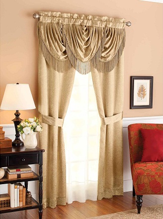 This curtain is a perfect one to make your window look like a work of art. It has two panels with an attached valance. The style and the fabric both are elegant. The valance has a multilayered effect and fringes at the end. It has a standard fit. It complements the decor in the room very well.