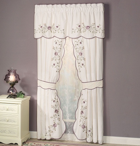 This is another classic piece of Vintage floral curtain. This cotton curtain has dusty lavender floral designs embroidered along with leaf motifs. The curtain has scalloped edges with lavender bindings. The valance is also embroidered and has scalloped edges. The curtains have tiebacks. It can be machine-washed. Try this wonderful curtain to give a face-lift to your rooms.