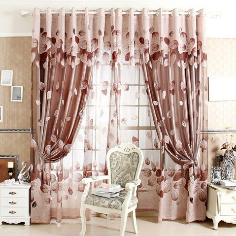 It is a cheap thick curtain in two fabrics. Two curtains are hanging on this door and both are in light fabric. The curtain has having big leaves design and the upper and below little portions are empty. It is two shaded curtains of the same colour.