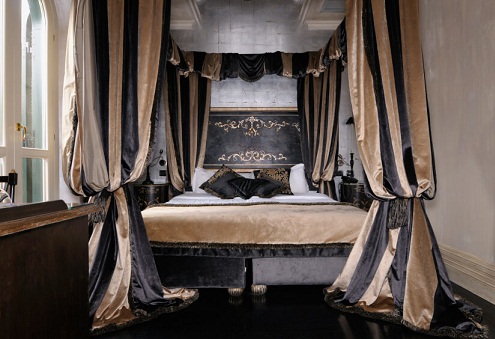 This thick curtain for the bedroom is used to cover the bed area when sleeping. The curtain is thick silk with black and golden stripes. The whole bed is covered with a curtain. The curtain is knotted with four pillars of bed and the rest is rolled over.