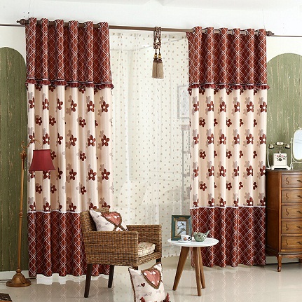 This thick bedroom curtain has a floral print in between the curtains. It is a red flower print on a cream base. The top and below parts of the curtain are embellished with a cream check design on red fabric. The curtain design is looking marvellous.