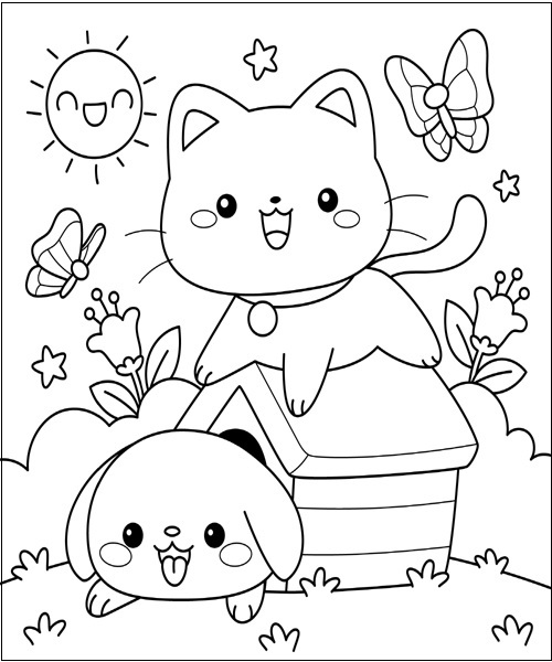 This Puppy and Kitty Colouring Page offers the best of both worlds – the adorableness of puppies and kittens in one delightful package. If you are an animal lover and cannot choose between the cuteness of a playful puppy or a fluffy kitten, this page is the right choice. Kids and adults can enjoy this coloring page, which beautifully creates heartwarming scenes where puppies and kittens play together, showcasing their charming antics. Choose a combination of a bright and mellow palette of colours for a contrasting look.