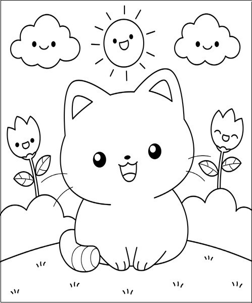Suppose you are looking for a Kitten Coloring Page that is easy to colour, especially for young artists and beginners. In that case, this page can be a perfect option. This coloring page with straightforward outlines and minimal details offers a stress-free experience for children. You can choose yellow for the cat, red, pink, or purple for the flowers, shades of green for the bushes and leaves, and blue for the sky, resulting in a beautiful page. However, you can always let kids choose the colours to make the page stand out.