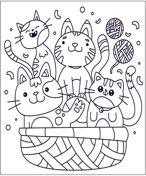 This is another captivating kitten colouring page with adorable kittens inside a basket full of Yarn. This playful sheet can captivate the hearts and imaginations of kids of all ages with crayons, colour pencils, or oil pastels as tools, depending on age. Try using different and contrasting colours for each cat, making them stand out beautifully. You can also offer this page for younger kids to colour while providing some assistance to fill in colours.