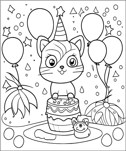 The Happy Birthday Kitten Coloring Pages are a delightful way to celebrate a special day with creativity and colour, especially for kids. This page features an adorable kitten in a birthday setting, ready to cut the cake with a cute look on its face. The charming illustrations add an extra element of joy to any birthday celebration, making them perfect for kids and adults alike. You can either create a personalized birthday card or give it to kids as an activity during the birthday party.