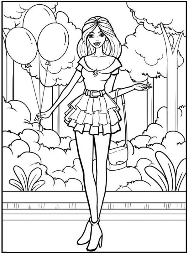When discussing Barbies, pretty dresses and beautifully matted hair come to mind. This beautiful colouring page depicts Barbie wearing a ruffled skirt and an off-shoulder shirt. You can use a single colour or different colours as you prefer. For example, use shades of green for the bushes and trees and brown for the tree trunks. Additionally, use blue, pink, and red for the balloons and black or pink for the heels.