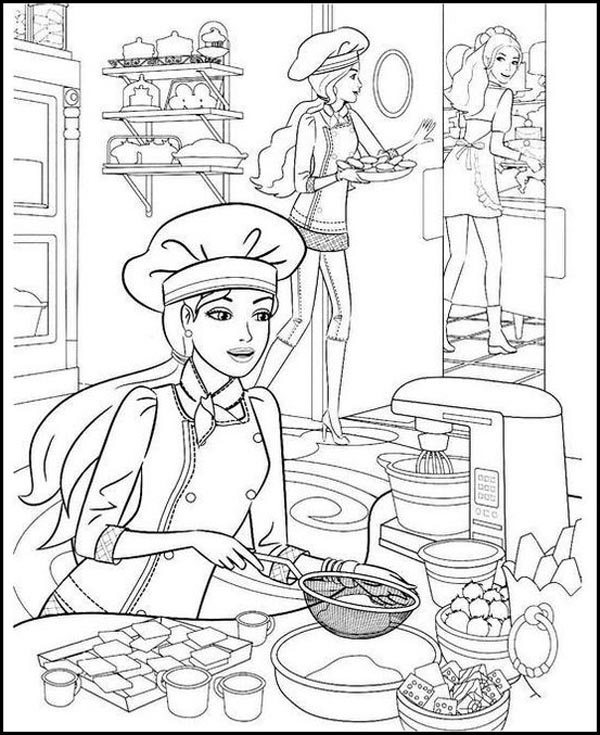 This is another free printable Barbie colouring page best suited for kids aged 9 to 12 because this page has intricate details that might not be suitable for younger kids. Leave the chef cap and coat in white and fill the other parts with multiple colours, creating a contrasting effect. Choose appropriate colours for the vegetables and fruits to make the page look real. Crayons are the perfect colouring tools to cover all the tiny details.
