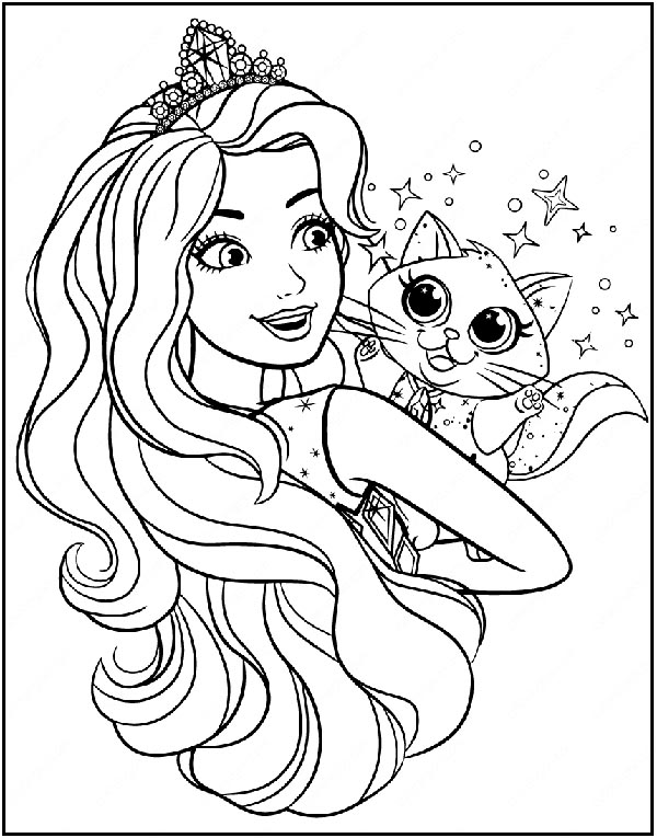 This Barbie colouring page only has the beauty’s head and has broad details, which can make it perfect for toddlers. Since the page is ideal for younger kids, crayons can be perfect for mess-free work. Choose brown or golden yellow for her hair, a golden glitter pen for her crown, brown for her cat, and pink for her dress. Finally, you can add silver glitter for the stars on the page.