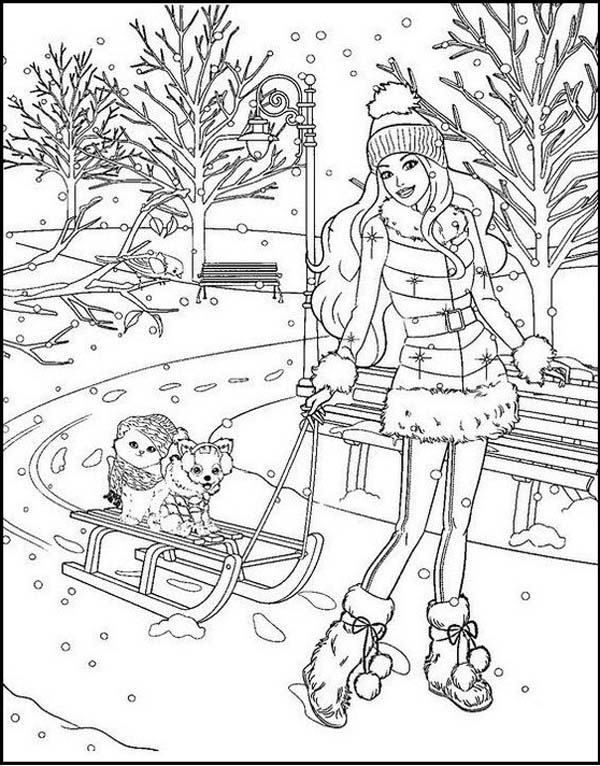 Have you ever seen Barbie holidaying? Then we must agree that those are the holidays we all aspire to enjoy. This colouring page depicts how Barbie loves to enjoy her holiday, including her attire with her dogs on a sledge on the ice. Leave the ice in white with shades of grey, brown for the tree branches and the park bench, and green for the leaves. You can use pale colours like baby pink or light blue for Barbie’s attire or bright colours like purple or red as per your preference.