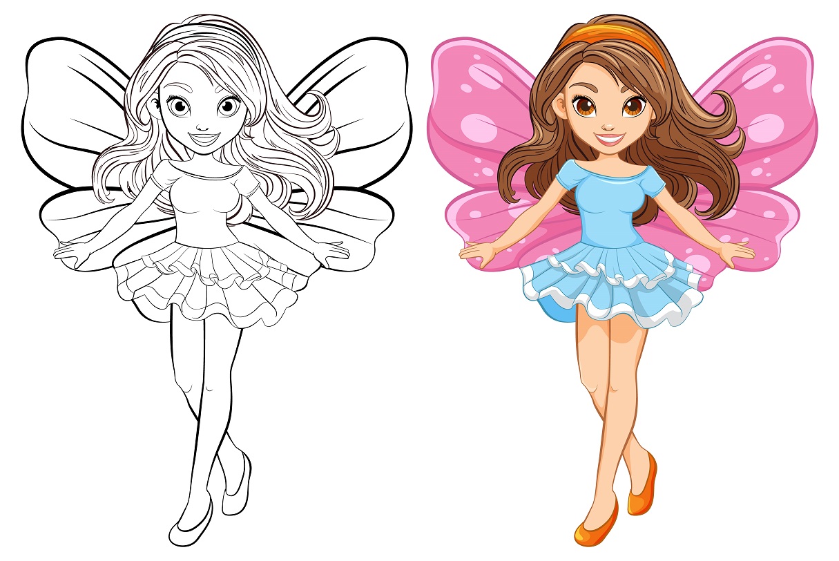 This is a simple Barbie colouring page suitable for kids of all ages, irrespective of gender, though girl kids might prefer it. Choose different shades of green for the bushes, light blue for the sky, and multiple colours for the butterfly. Use biege for Barbie’s skin, golden yellow for her hair, and purple, lavender, or pink for the dress, with a touch of sparkle here and there. Younger kids might do well with crayons, and older kids might work well with brush pens or watercolours.